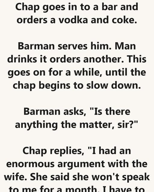 Chap goes in to a bar and orders a vodka and coke. Barman serves him. Man drinks it orders another. This goes on for a while, until the chap begins to slow down. Barman asks, “Is there anything the matter, sir?” Chap replies, “I had an enormous argument with the wife. She said she won’t … Read more